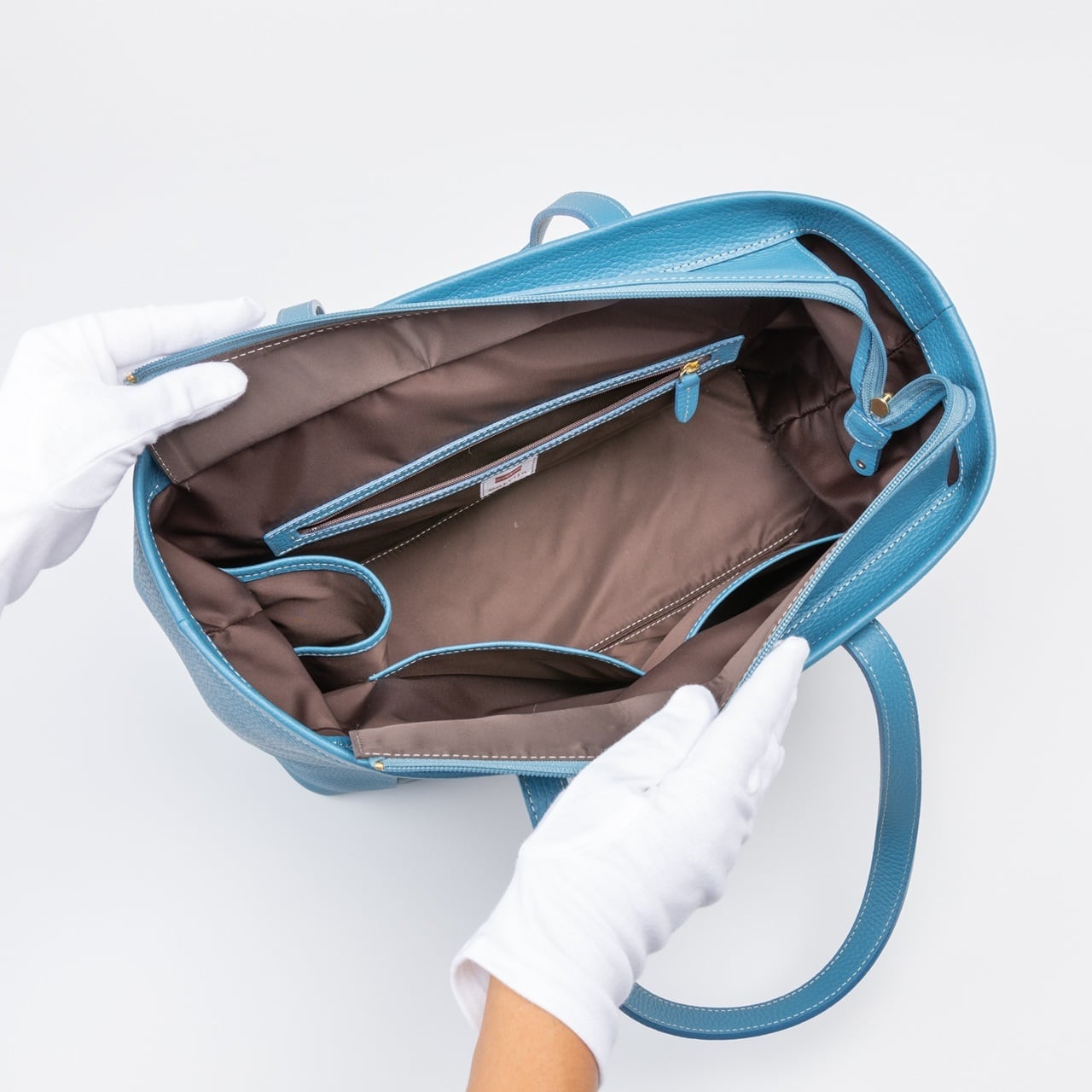 明るいブルーの本革と組み合わせて、おしゃれなトートバッグに仕上げました。